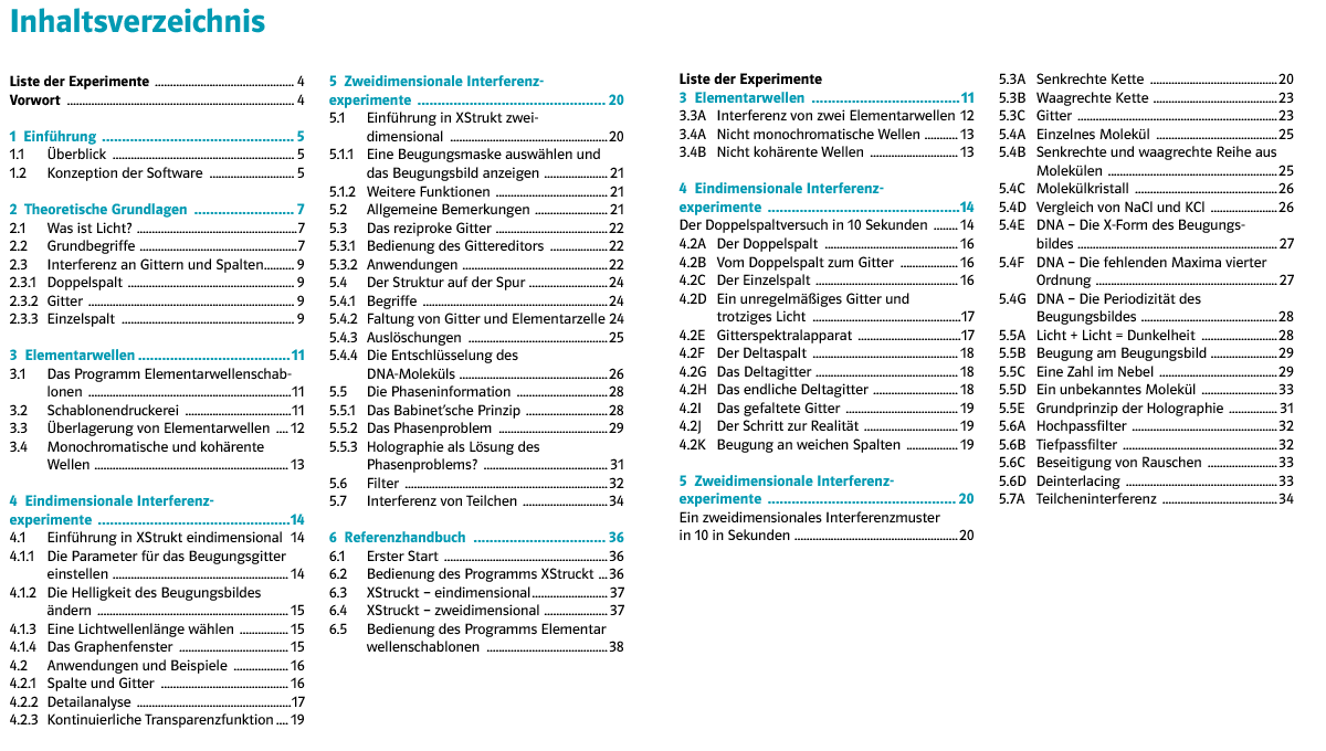 Den Schwerpunkt des beiliegenden Softwarepakets bildet die Computeranwendung "XStrukt - Beugung und Interferenz", die in zwei Teile zerlegt ist: die eindimensionalen und die zweidimensionalen Beugungsexperimente. Weiterer Bestandteil ist das Programm "Elementarwellenschablonen". Damit können einfache Interferenzerscheinungen mit Elementarwellen demonstriert werden. Außerdem eignet es sich hervorragend zum Ausdrucken von "Interferenzfolien" für den Overheadprojektor.